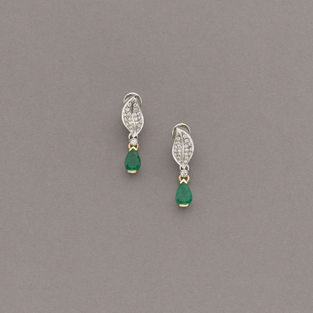 Orecchini pendenti perno e clips con foglia in oro bianco con pavé di diamanti rotondi taglio a brillante e due gocce di smeraldo pendenti in oro giallo, g.11,00 Emerald and diamond-set ear pendants