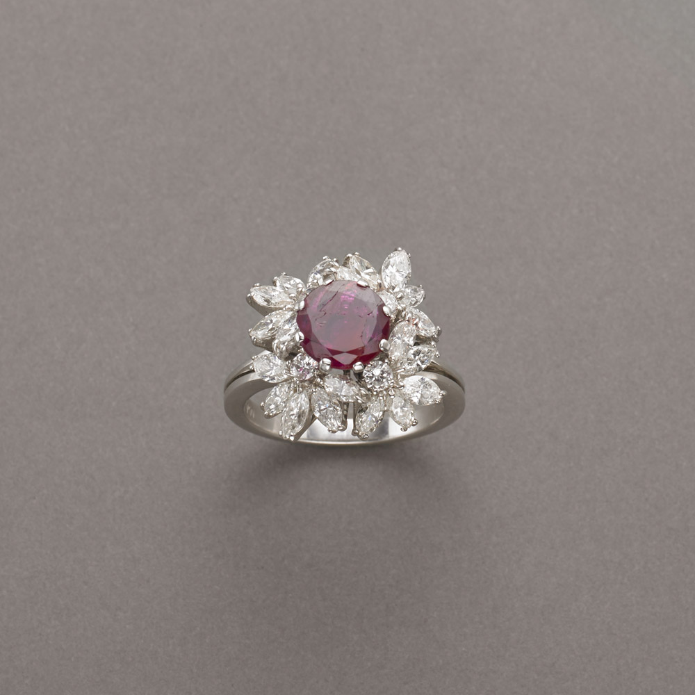 Anello in oro bianco con al centro un rubino rotondo taglio composito con diamanti rotondi e marquise, g.7,90, misura 15/55 Ruby and diamond white gold cluster ring