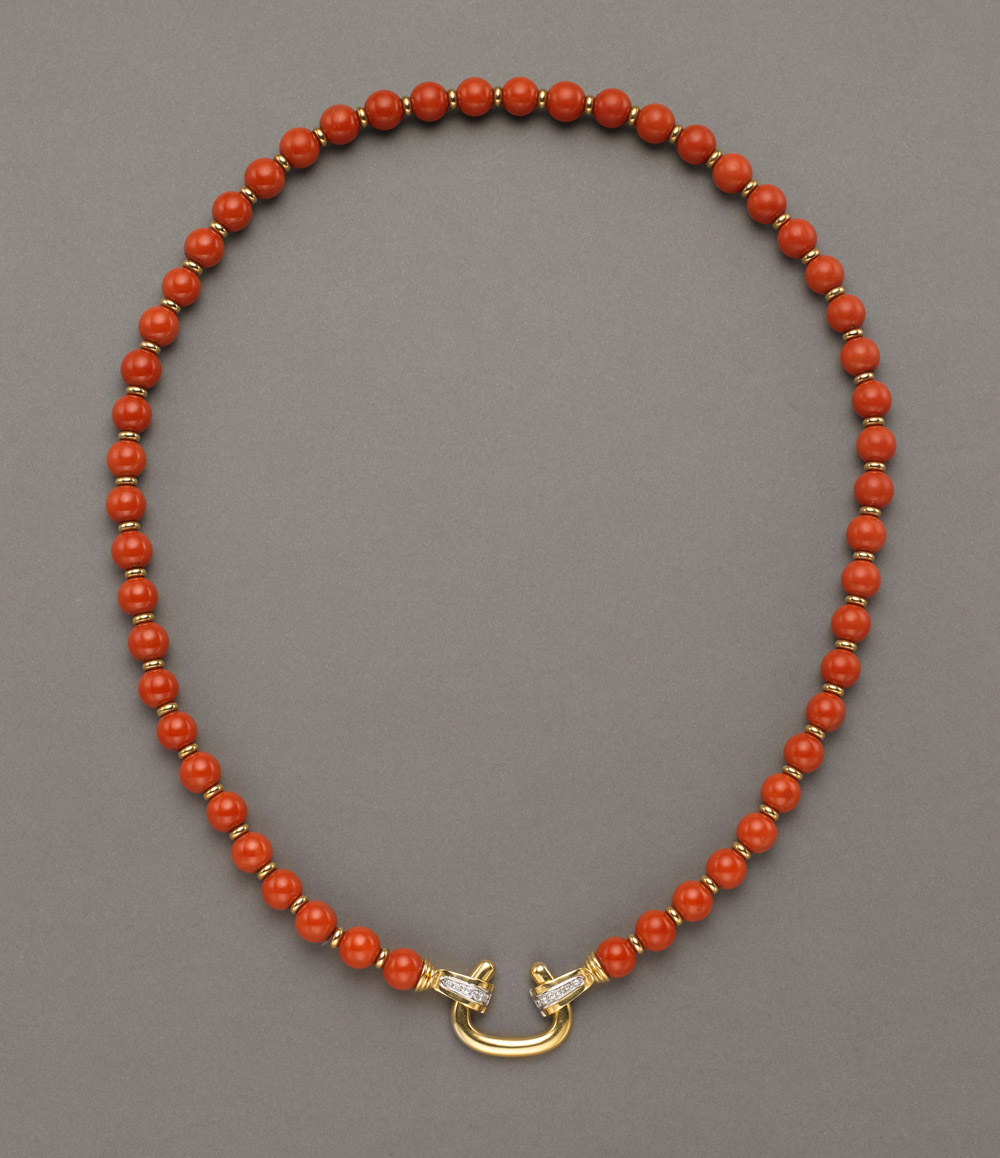 Collana di corallo rosso/arancione mediterraneo 8,50/9,00 mm con distanziatori e centrale in oro giallo,nei due ganci diamanti rotondi taglio a brillante, lungh. cm 58, g.69,70 Mediterranean red/orange coral necklace with gold spacers and diamond gold clasp
