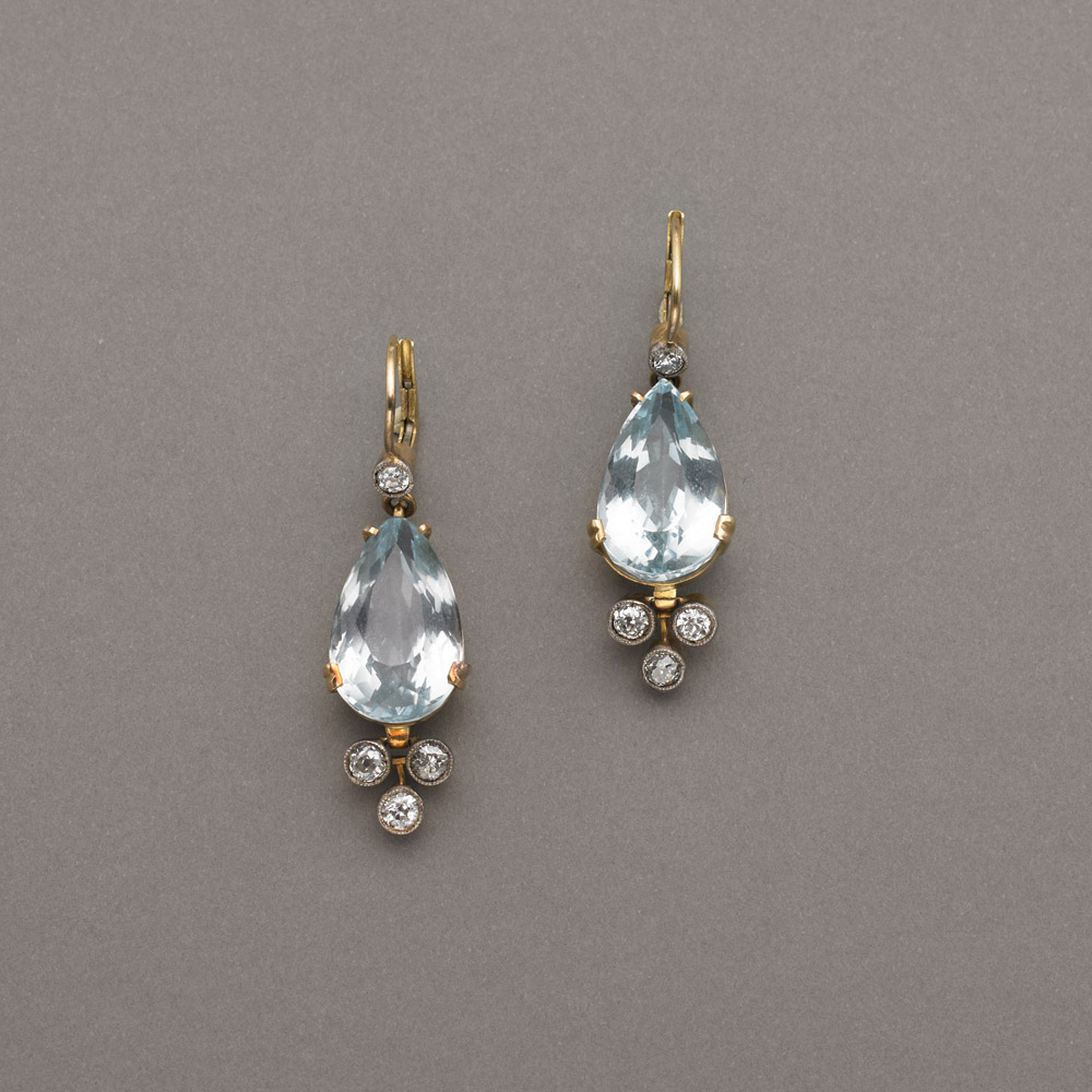 Orecchini pendenti in oro giallo con due acquamarine a goccia taglio composito e otto diamanti rotondi incastonati in argento, g.14,80 Pair of acquamarine and diamond gold ear pendants