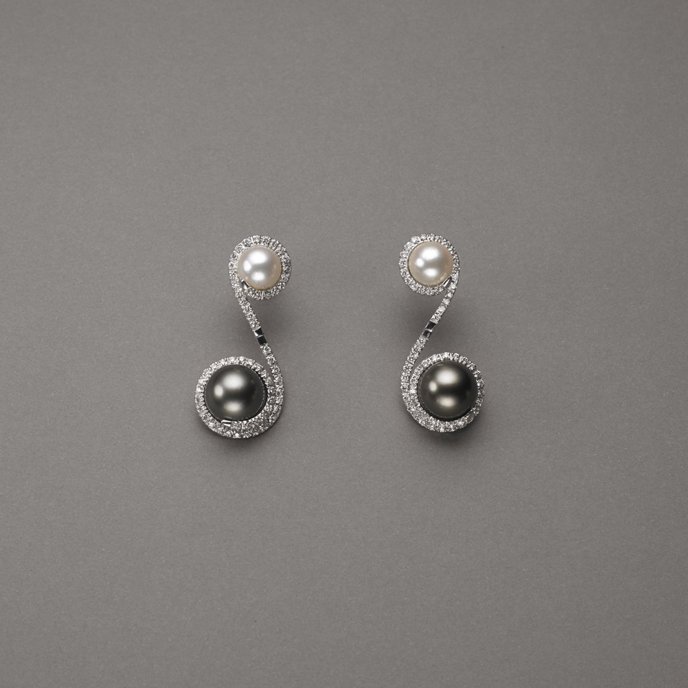 Orecchini pendenti in oro bianco con due perle bianche e due nere coltivate contornate da diamanti rotondi taglio a brillante per ct.1,20 circa, g.15,70. Pair of white and black pearl and diamond white gold ear-pendants