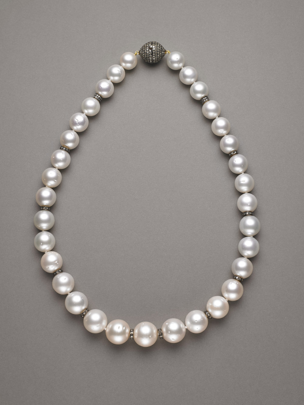 Collana ad un filo di perle coltivate bianche d'acqua dolce, scalate da 12 a 16mm con distanziatori e chiusura in argento e diamanti. Lungh. 52 cm. Sweet water pearl necklace with diamond nd silver spacers