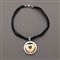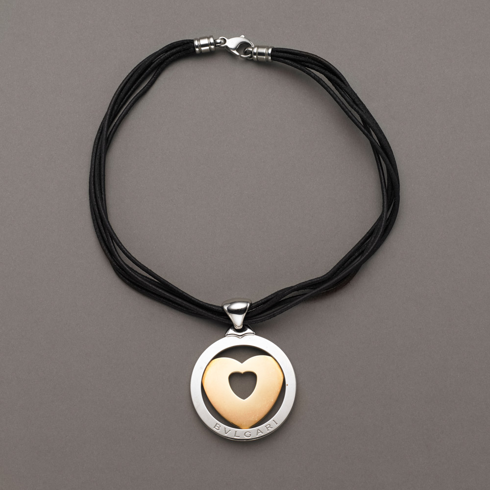 Ciondolo in acciaio e oro con cerchio ed al centro un cuore traforato tenuto da cinque lacci in pelle con chiusura a moschettone, g.36 complessivi, BVLGARI leather necklace with steel and gold heart pendant. Bulgari
