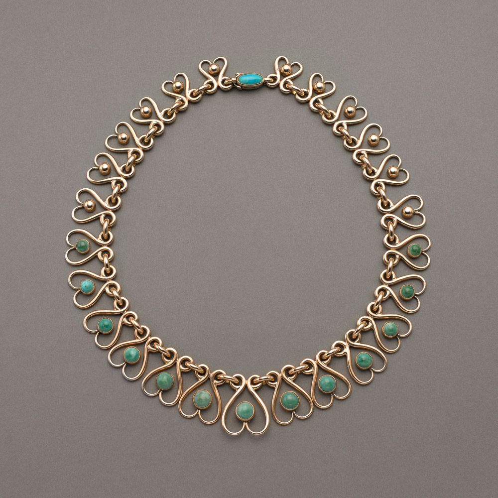 Collier artigianale di particolare fattura in oro rosso a guisa di cuori a scalare, centrati da turchesi rotondi taglio cabochon o da mezze boules in oro. g.69,70 lungh. 39 cm Handicrafted red-gold necklace with cabochon torquoises or gold demi-boules