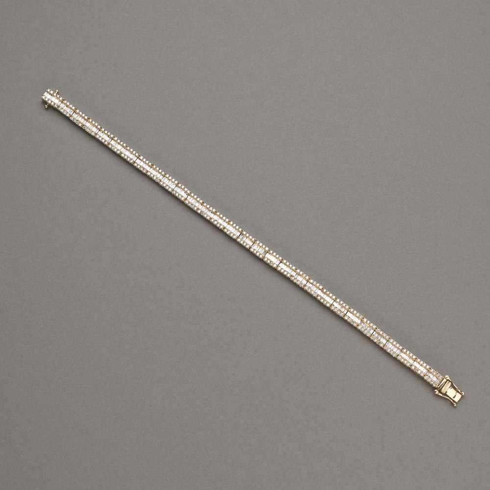 Bracciale in oro giallo con diamanti centrali taglio a baguette accompagnati da due file di diamanti taglio a brillante per complessivi. ct.3,32, gr. 11,00. Diamond and gold line bracelet
