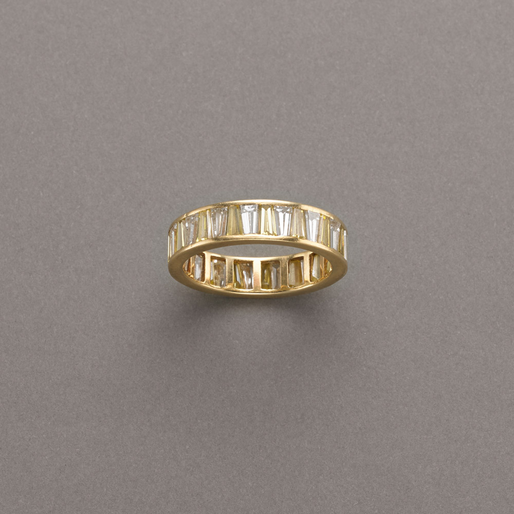 Fedina "eternity" in oro giallo a rotaia con alternati diamanti incolore e Fancy-yellow forma tapered, g.3,80, misura: 16/56 Diamond and gold eternity ring