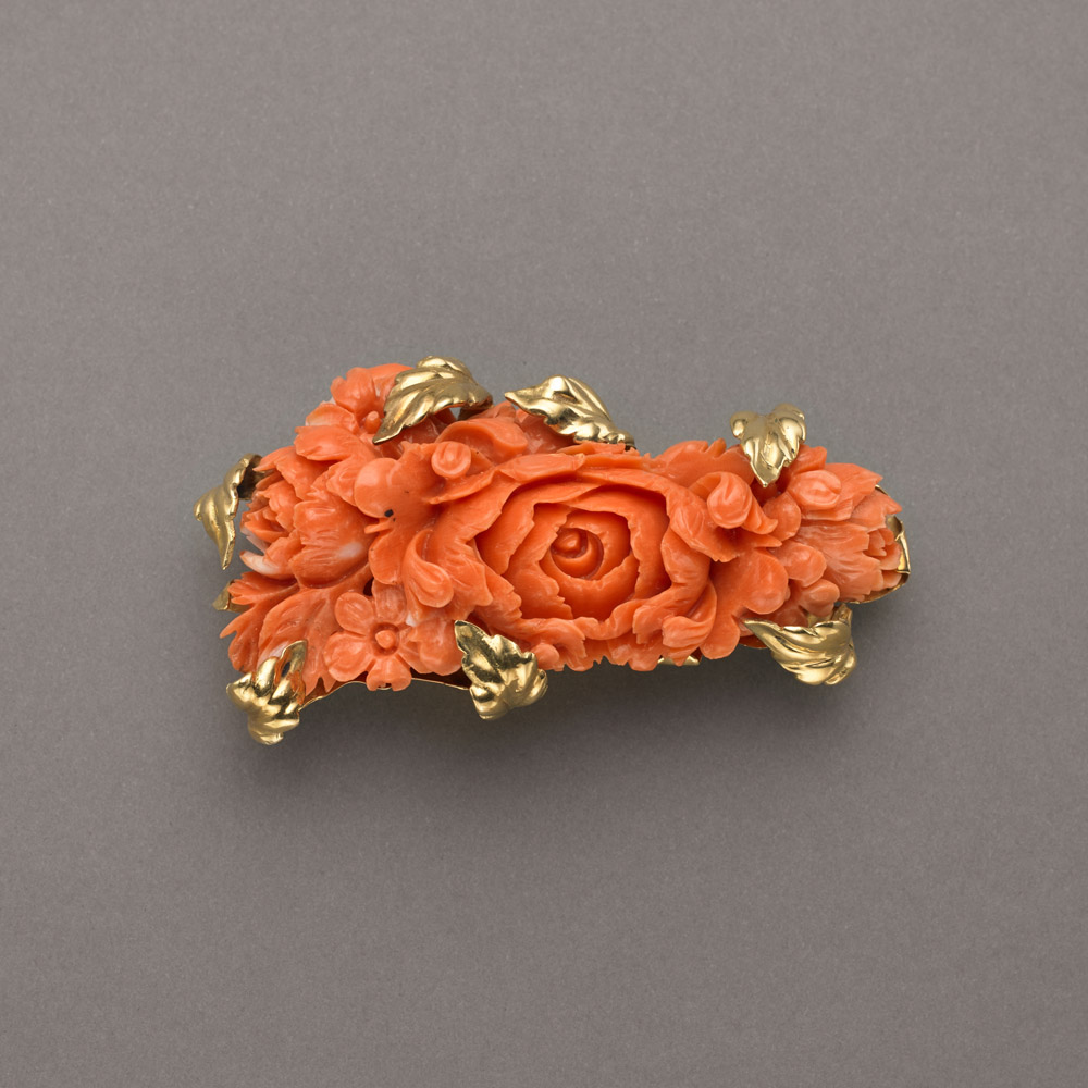 Lot 113 | Spilla con base e foglie in oro giallo a trattenere un bouquet con rose di...