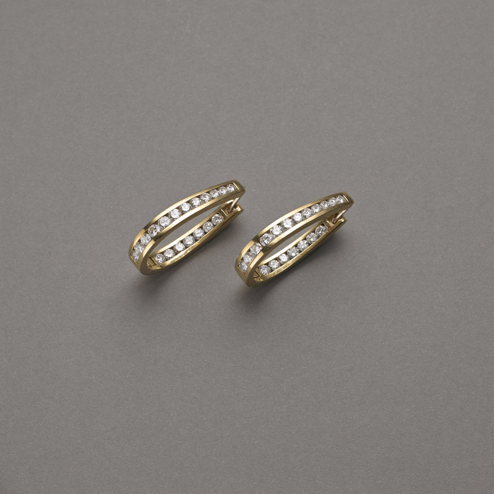 Orecchini a guisa di goccia in oro giallo con incastonati diamanti rotondi taglio brillante all'interno e all'esterno, g.13,50 Diamond set gold earings