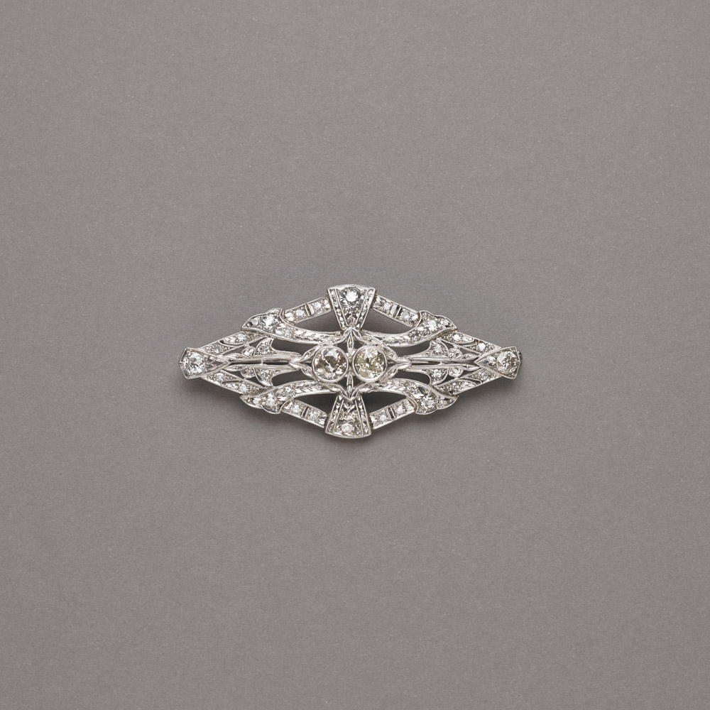 Spilla in oro bianco romboidale con piccoli diamanti rotondi e due piu grandi centrali probabilmente 1920 circa, gr. 16,60. Diamond white gold brooch