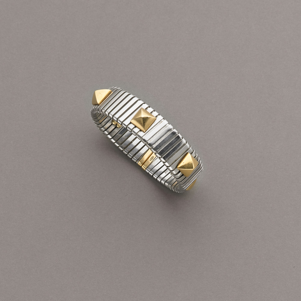 Bracciale aperto semi-rigido e a molla in acciaio con finiture e borchie piramidate in oro giallo, complessivi g.50,60, BVLGARI Gold and steel spring-bracelet. Bulgari