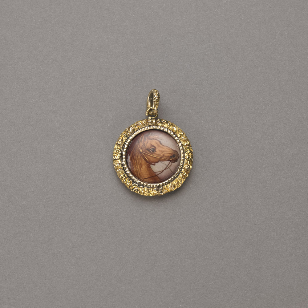 Pendente in oro giallo con miniatura di testa di cavallo, decorato con smalti...