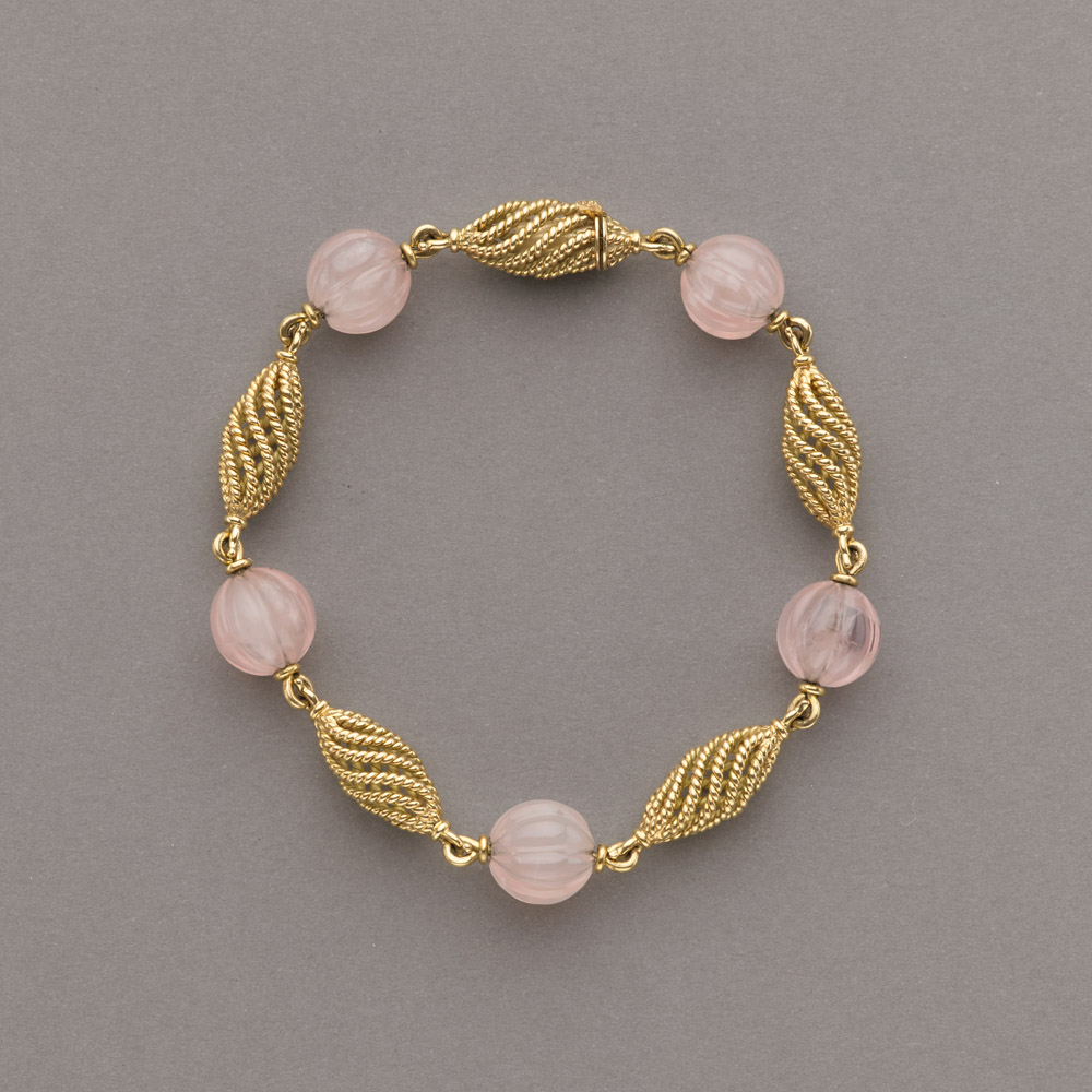 Bracciale con losanghe a tutto tondo in oro giallo, distanziate da boules di quarzo rosa a spicchi,lungh. 20,00 cm g.25,50 Pink quartz and gold bracelet