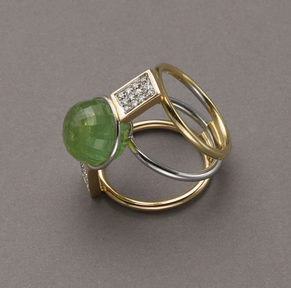 Anello a tre fili in oro giallo e bianco uniti da due pavé di diamanti rotondi, taglio a brillante a fermare un globo centrale sfaccettato di tormalina verde, g.14,80, misura: 13-13/52-53 Diamond-set and tourmaline globe bi-coloured gold ring