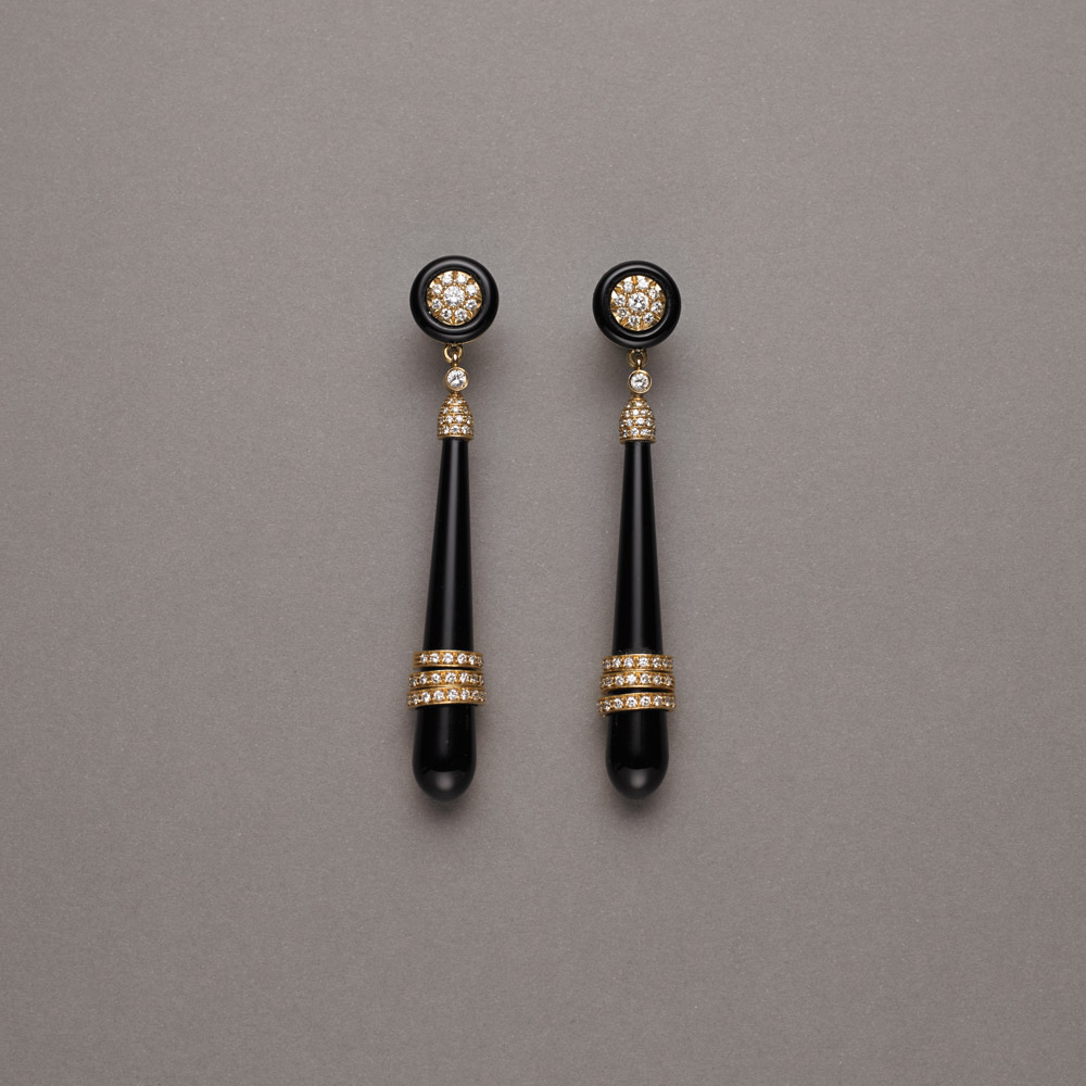 Orecchini pendenti perno e farfalla in oro giallo ed onice e diamanti tondi taglio brillante, g.19,60 Onyx and diamond ear-pendants