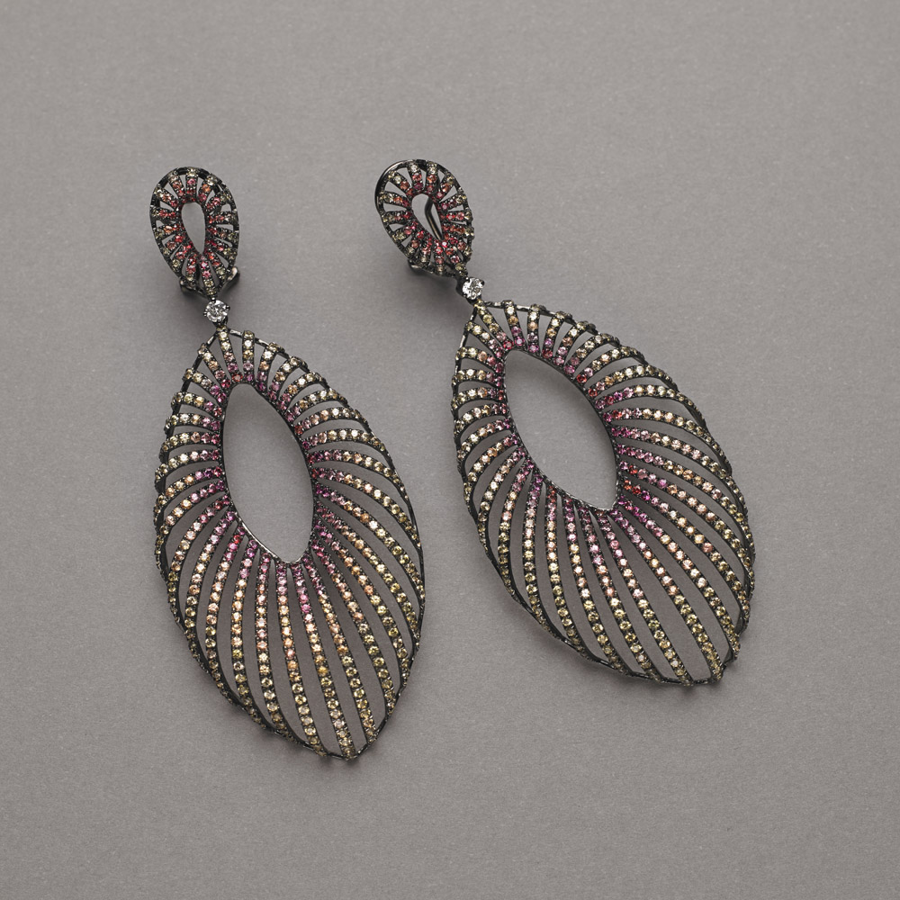 Particolari orecchini pendenti in oro rodiato nero con zaffiri rotondi sfumati per ct.8,28 e diamanti per ct.0,14. gr. 16,00 Sapphire and diamond black gold ear pendants