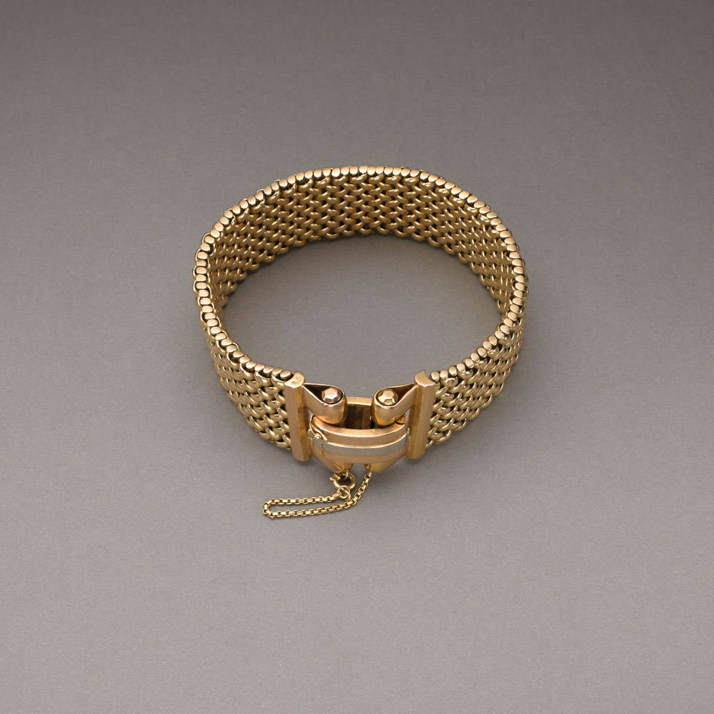 Bracciale morbido a maglia intrecciata in oro giallo con chiusura in oro bianco e rosso, con catena di sicurezza, lungh. cm 22,00, alt. cm 2,50, g.72,90 Gold mesh bracelet with bi-coloured gold clasp