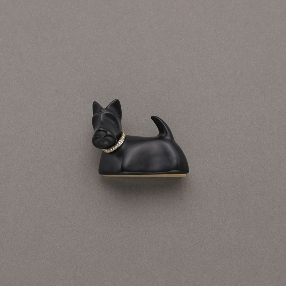Spilla in oro giallo a forma di Scottish Terrier in onice opaco con collare in oro bianco e diamanti, g.16,90 Onyx and diamond Scottish Terrier gold brooch