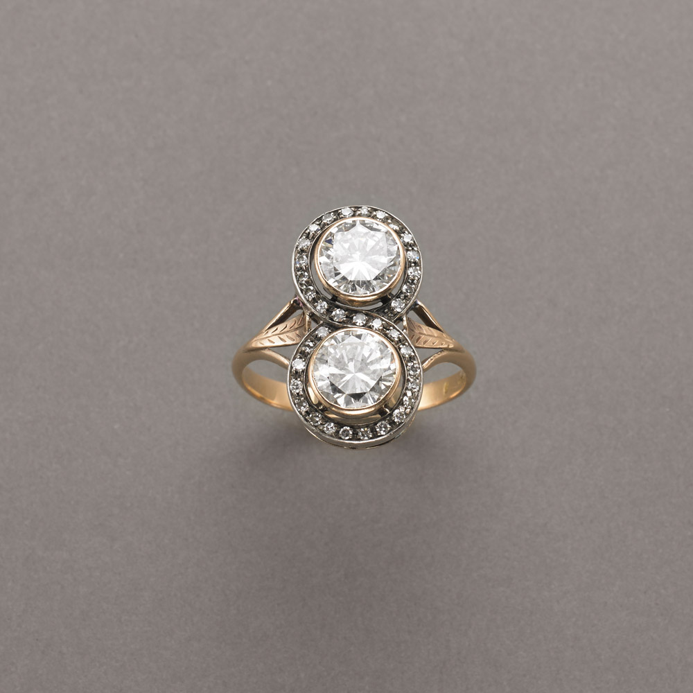Anello d'epoca in oro rosso e argento con due diamanti rotondi taglio a brillante di ct.3,00 circa complessivi contornati da diamanti rotondi, g.5,30, misura: 22/62 Diamond and diamond red gold retro ring