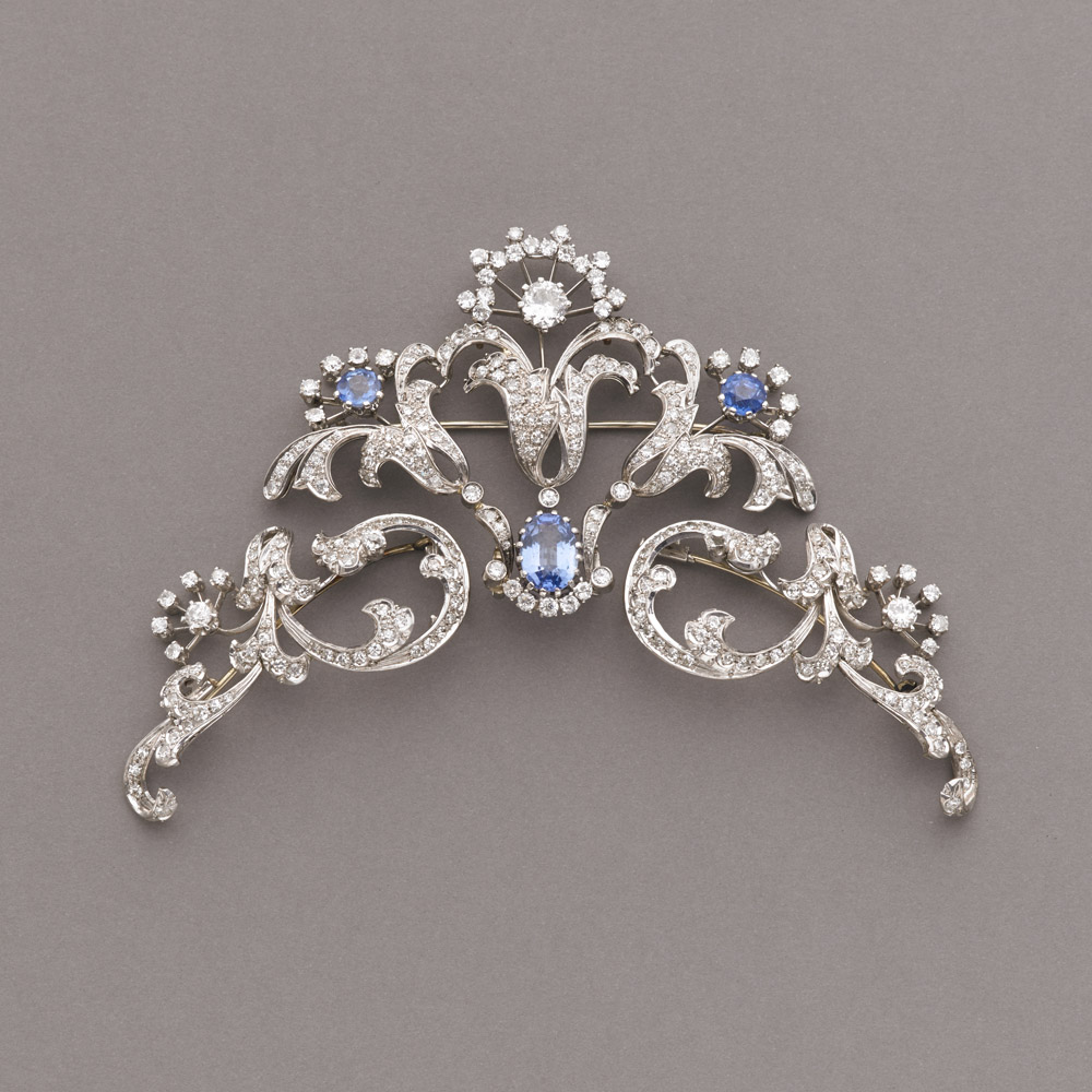Diadema in platino del 1920 circa composto da tre spille scomponibili con al centro un diamante rotondo taglio a brillante di ct.1,00 circa, uno zaffiro ovale taglio composito e due rotondi laterali, il tutto rifinito con diamanti rotondi taglio a brillante vecchio europeo e huit-huit, g.51,40 circa, sono mancanti le fascette di congiunzione tra le tre spille per formare il diadema Diamond, sapphire and platinum tiara disassemblable into three brooches, circa 1920 (loss of conencting part to form tiara)