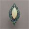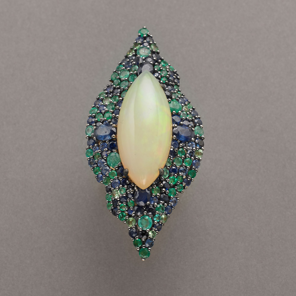 Anello in oro giallo a losanga con pavè di zaffiri e smeraldi per ct.3,77 e 1,62 finemente incastonati a contornare un opale nobile di forma marquise, taglio cabochon, ct.7,71 gr. 11,90 misura 13/53 Sapphire and emerald-set gold ring centered by an opal