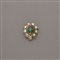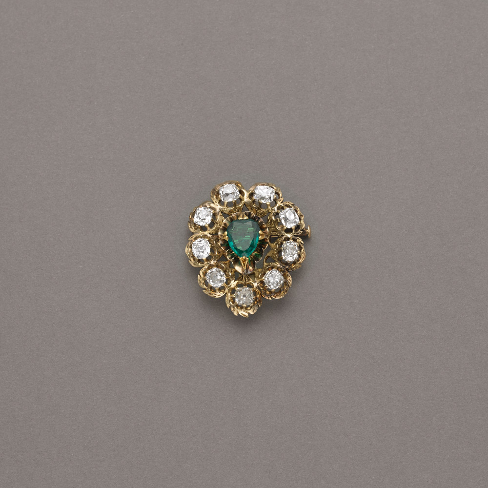 Spilla in oro giallo con nove diamanti di forma cuscino taglio antico per un totale di ct.3,50 circa e uno smeraldo centrale a goccia taglio composito di ct.0,90 circa, g.8,30 Accompagnata da Jewelry REPORT GECI n.1009559 del 23/03/2015 Diamond and gold brooch centered by an emerald Appended GECI Jewelry Report