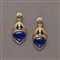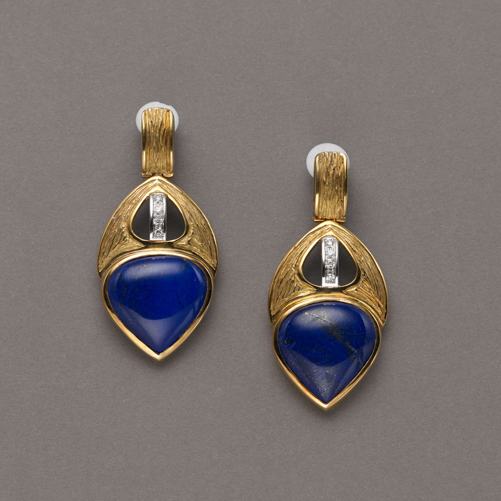 Orecchini pendenti perno e clips in oro giallo e bianco con lavorazione lucida e graffiata, diamanti rotondi taglio a brillante e due goccie di lapislazzuli, g.27,40 Lapislazuli and diamond gold ear-pendants