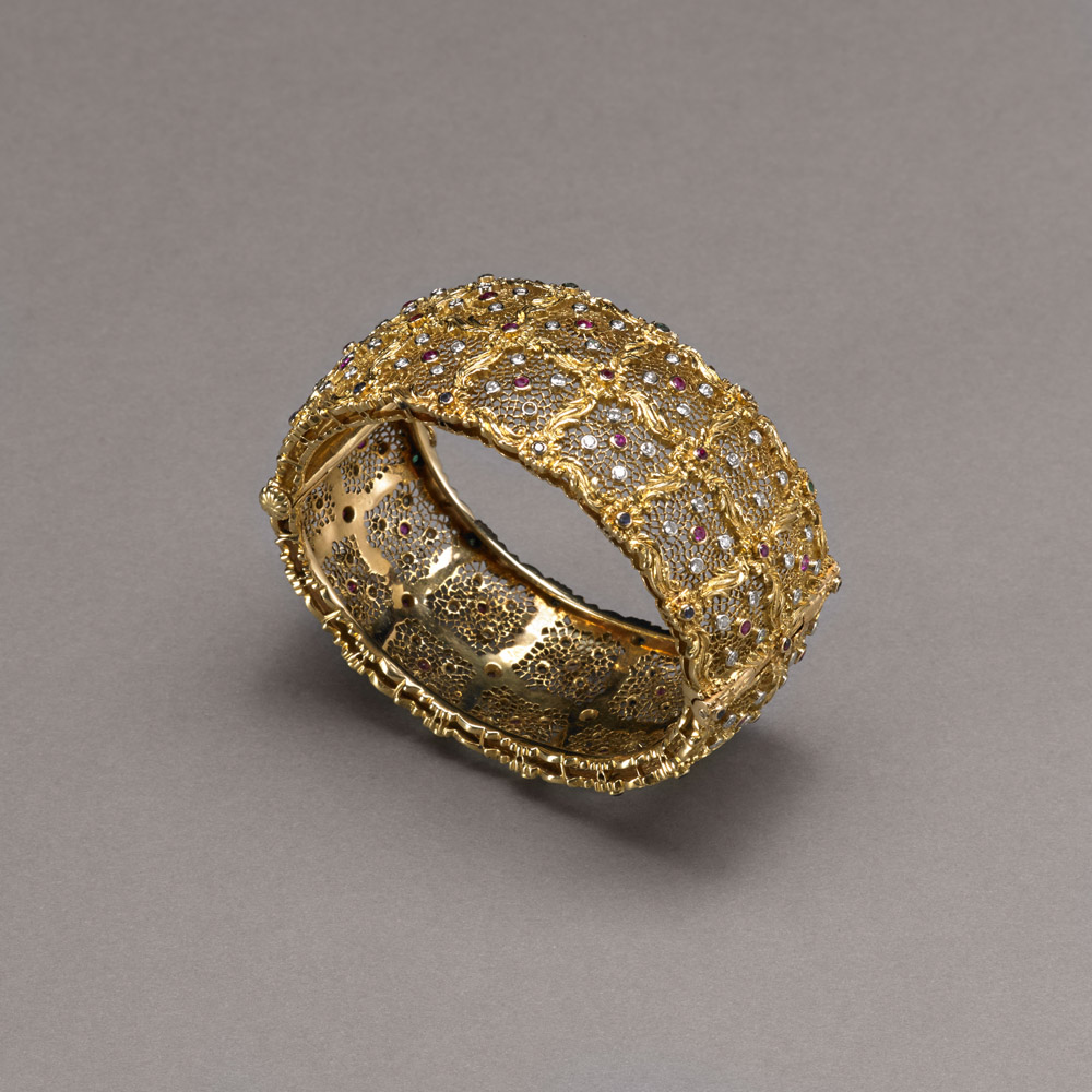 Bracciale rigido in oro giallo con lavorazione a filigrana con incastonati piccoli diamanti, rubini, zaffiri e smeraldi, g.88,50 Diamond, ruby, sapphire and emerald filigree gold bracelet