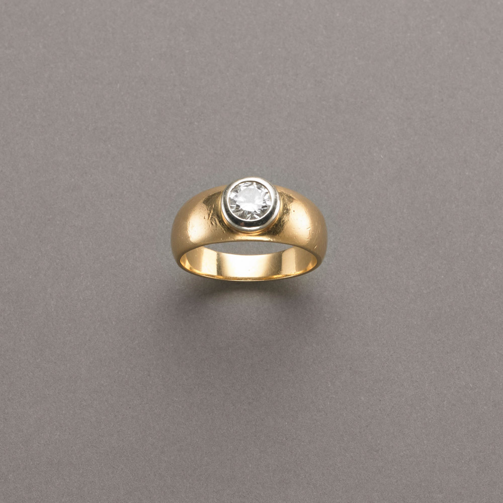 Anello a fascia in oro giallo con diamante bordato in oro bianco, taglio a brillante, ct.0,60 circa, g.7,80 Diamond single stone band ring