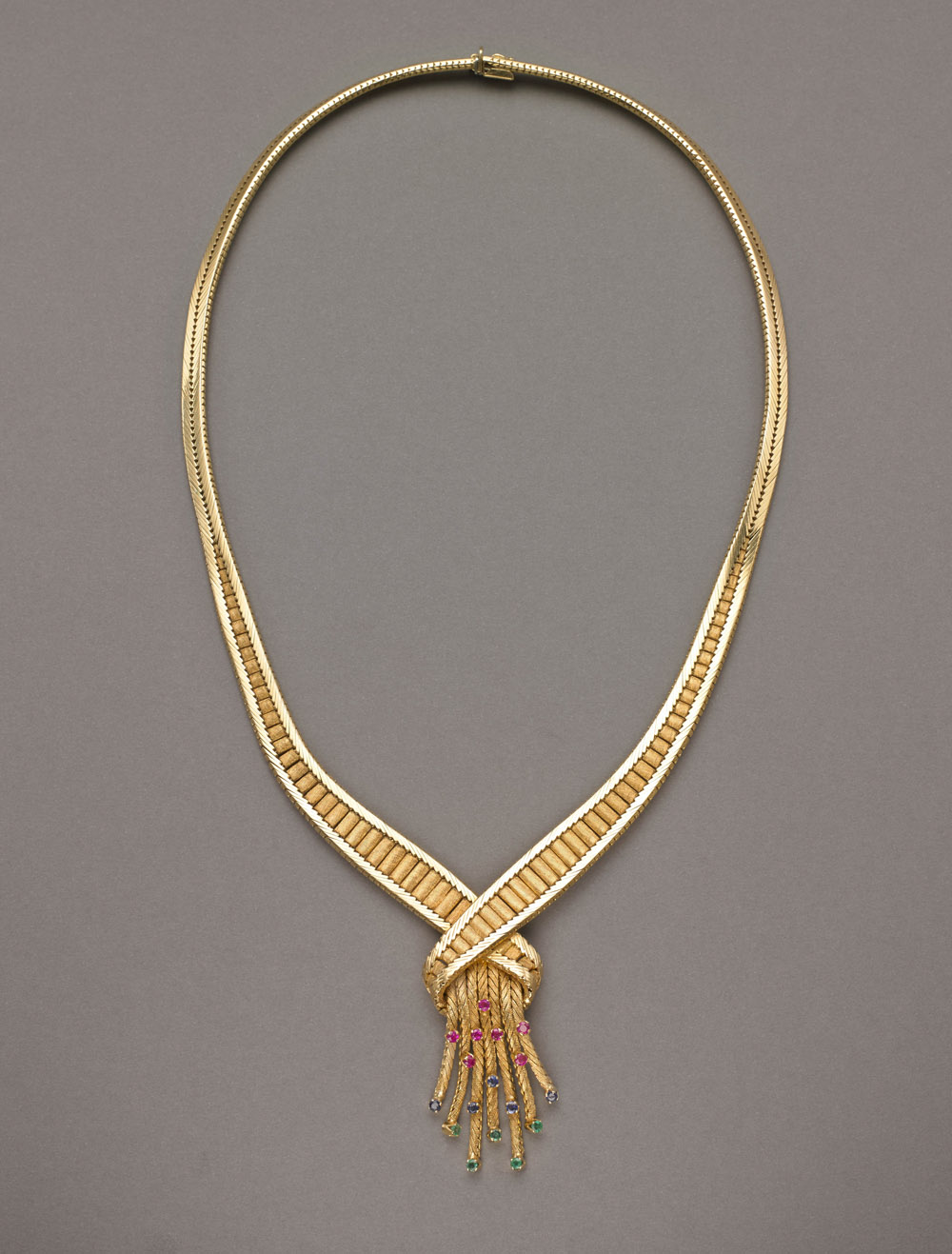 Collier con centrale pendente in oro giallo lucido e satinato dove nel pendente sono incastonati rubini, zaffiri e smeraldi rotondi, g.91,20 Gold necklace with ruby, sapphire and emerald inset pendant