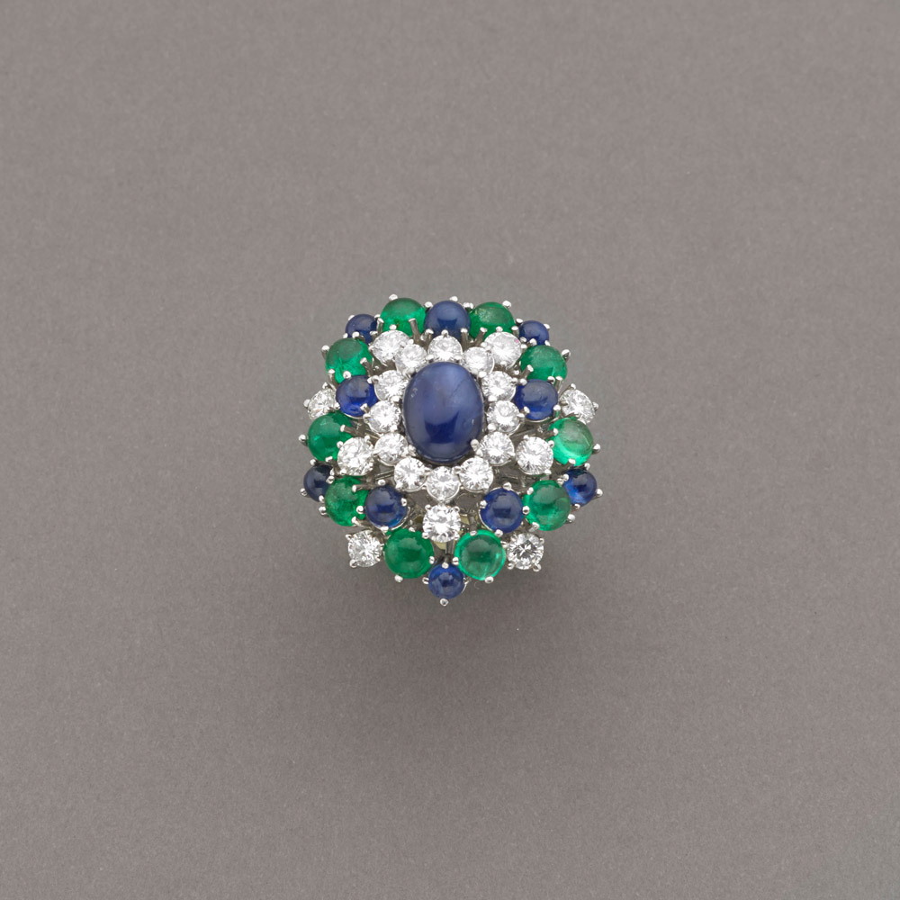 Lot 292 | Anello in oro bianco con smeraldi e zaffiri rotondi taglio cabochon, diamanti...