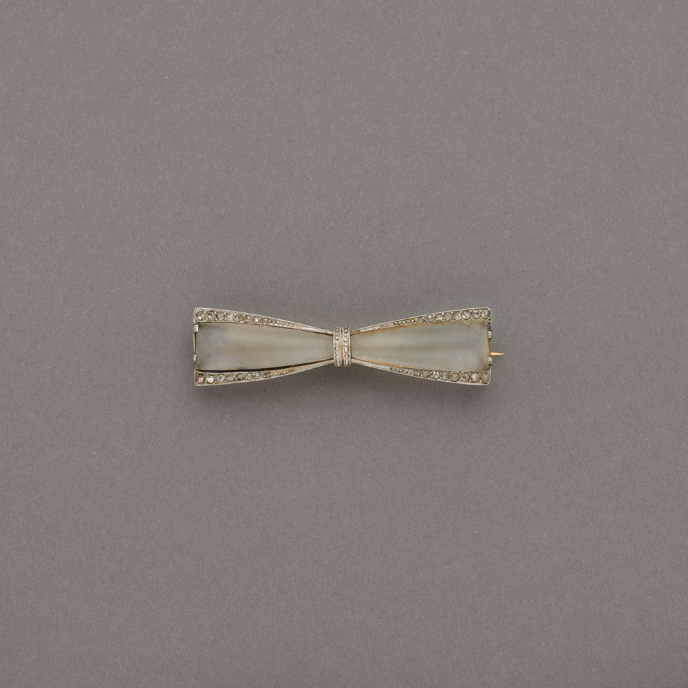 Raffinata spilla 1920/25 circa in oro giallo e bianco a guisa di nastro con diamanti taglio mezza rosetta a contornare due quarzi ialini satinati di forma trapezoidale, g.5,10 Quartz and diamond bi-coloured gold bow brooch