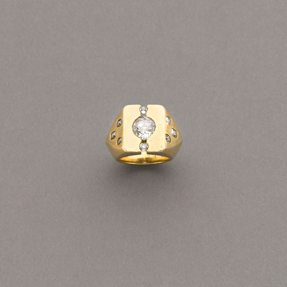 Particolarissimo anello in oro giallo di forma geometrica con diamante centrale taglio a brillante vecchio europeo ed altri più piccoli di varie forme e taglio, g.22,80, misura: 4/44. Diamond and diamond gold cluster ring