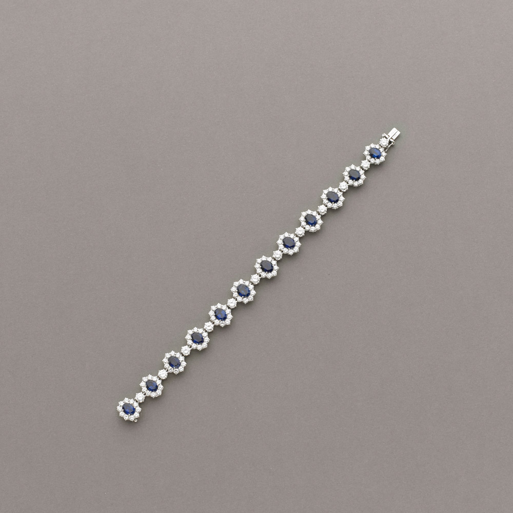 Bracciale in oro bianco a griffes con dodici zaffiri taglio ovale ct 7,00/7,50 circa totali e diamanti taglio brillante ct 8,40 circa totali (lunghezza cm 17,50) gr 22,50 A sapphire diamond white gold bracelet