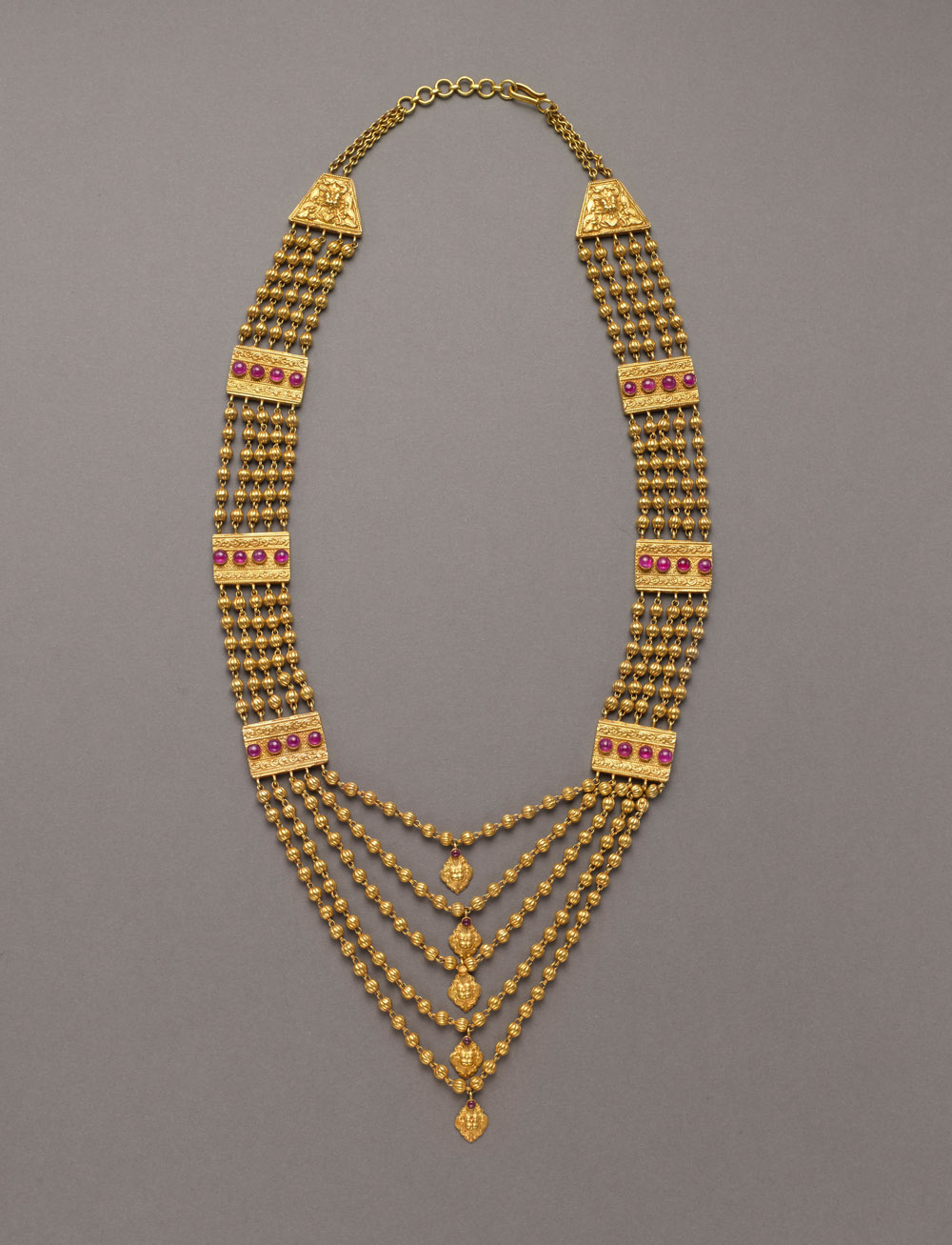 Collana indiana antica a cinque giri, col primo a cm 57 di piccole boules a guisa di coriandolo con al centro charms pendenti, i cinque fili sono tenuti a distanza regolare da placche in oro lavorato con incastonati al centro quattro rubini rotondi cabochon. g.68,70 (piccolo rubino mancante in un pendente) Five strand Indian gold bead necklace (small ruby missing in the pendant)
