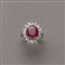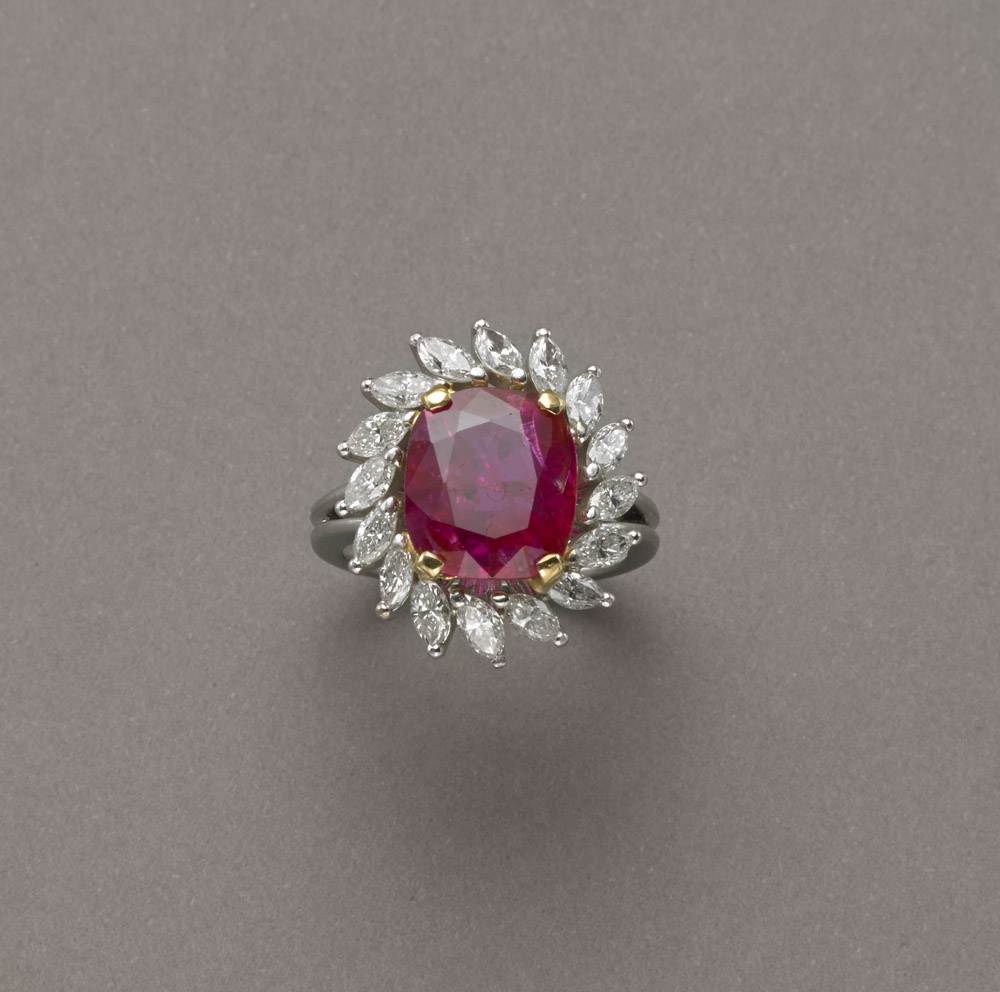 Anello in platino con rubino a cuscino taglio composito di ct.3,65 circa e a contorno diamanti a marquise per ct. 1,60 circa g. 10,60 misura 13/53. Ruby and diamond platinum cluster ring