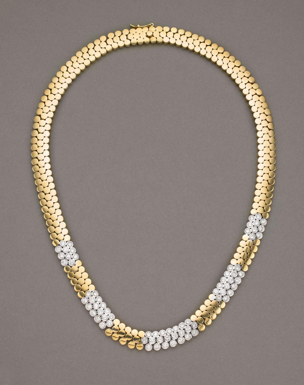 Lot 327 | Collier in oro giallo e bianco con maglia modulare con incastonati sull'oro...