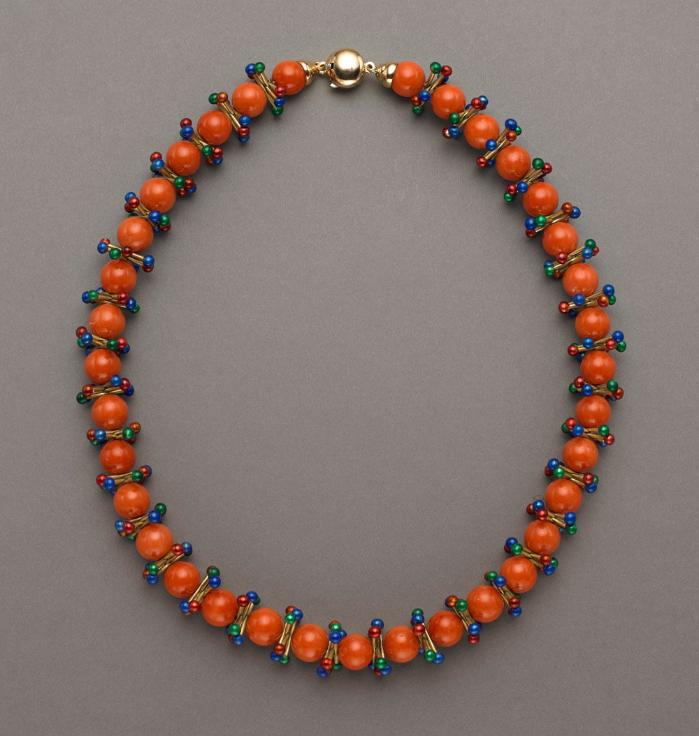 Collier di corallo arancione/rossastro con oro e smalti di vari colori a ricordare gli "atomi". Anni '80, design Giancarlo Montebello. g. 117,00 Red/orange coral necklace with gold and enamel spacers. 1980s design Giancarlo Montebello