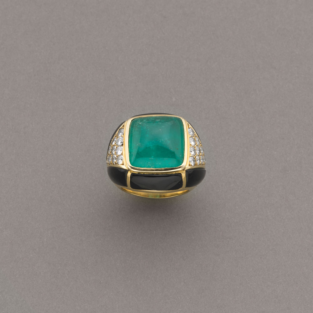 Anello in oro giallo a chevalier centrato da smeraldo piramidale taglio cabochon ct 9,00/10,00 circa e motivi laterali in pavè di diamanti e onice g.18.80, misura 10,50. Emerald and diamond gold ring
