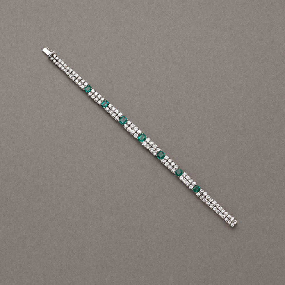 Bracciale in oro bianco con diamanti rotondi taglio a brillante ct.8,80 circa disposti a scalare su due file interrotte da sette smeraldi ottagonali taglio a gradini per ct.4,30 circa, g.24,70, lungh. 18cm Emerald and white gold bracelet