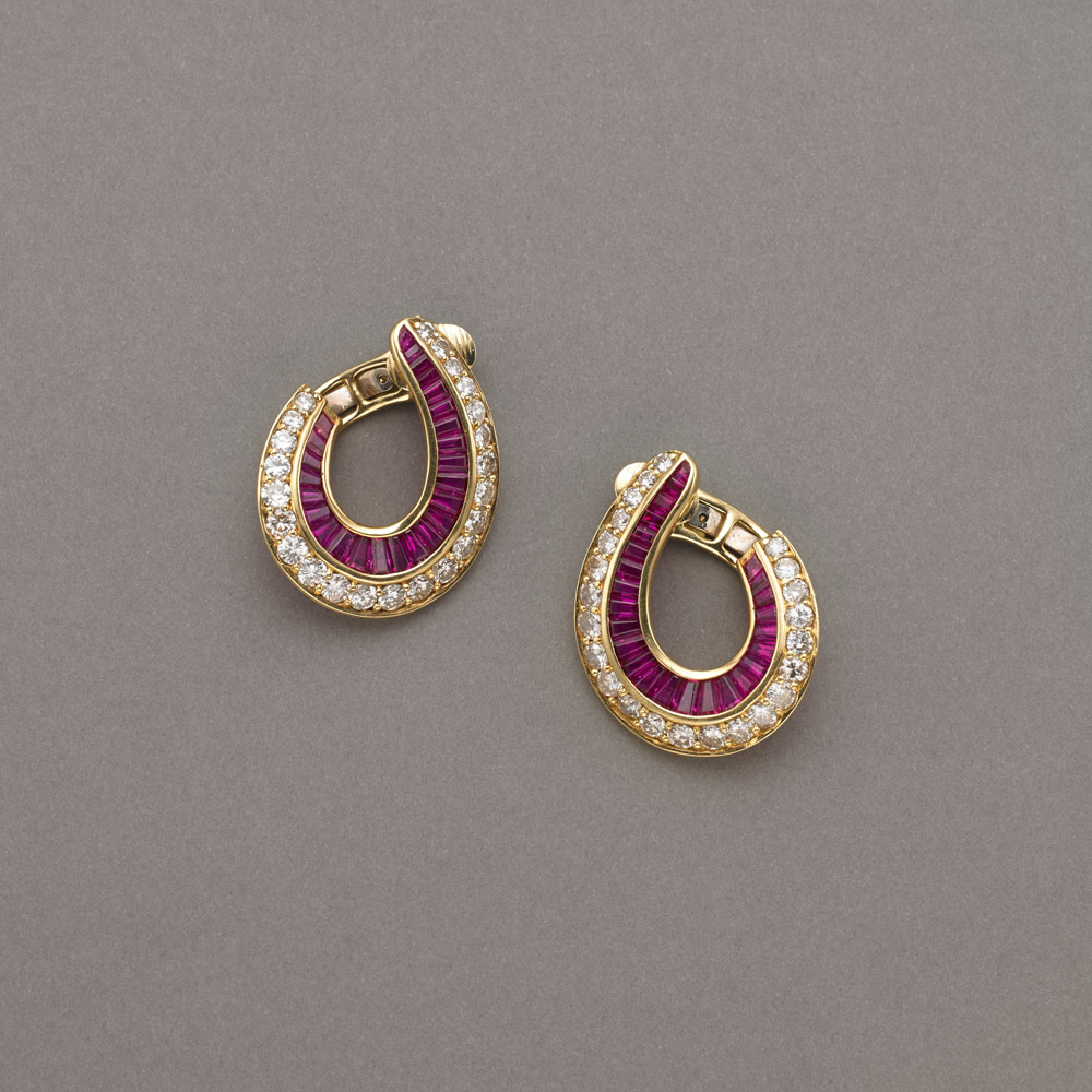 Orecchini a clips in oro giallo con rubini tapered e diamanti rotondi taglio...
