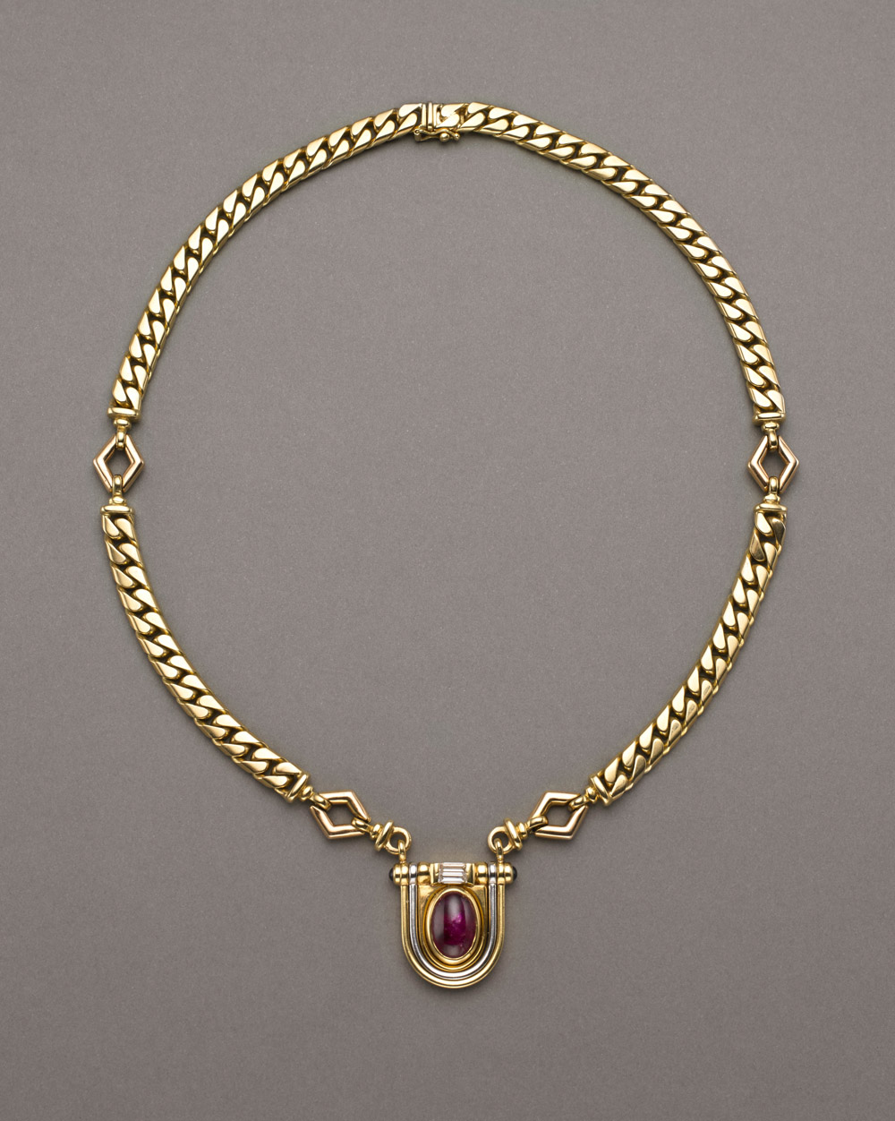 Collier in oro bianco e giallo a maglia groumette piatta con distanziatori a guisa di rombo e centrale impernato da due zaffiri cabochon rotondi, due diamanti a baguette ed un rubino ovale cabochon. g.79,20. BVLGARI CM 4 11 Link chain gold necklace with sapphires centered by a ruby medallion. Bulgari