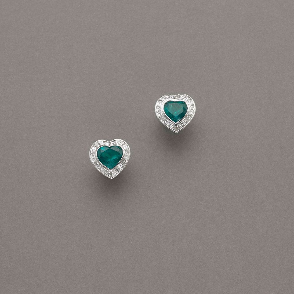 Orecchini in oro bianco a guisa di cuore con al centro due smeraldi di forma a cuore per complessivi ct.4,50 circa e contornati da diamanti di forma trapezioidale e carrè, per ct.1,80 circa, g.7,60. Accompagnati da Jewelry REPORT GECI n. 1009551 del 23/03/2015 Emerald and diamond white gold heart earings Appended GECI Jewelry Report