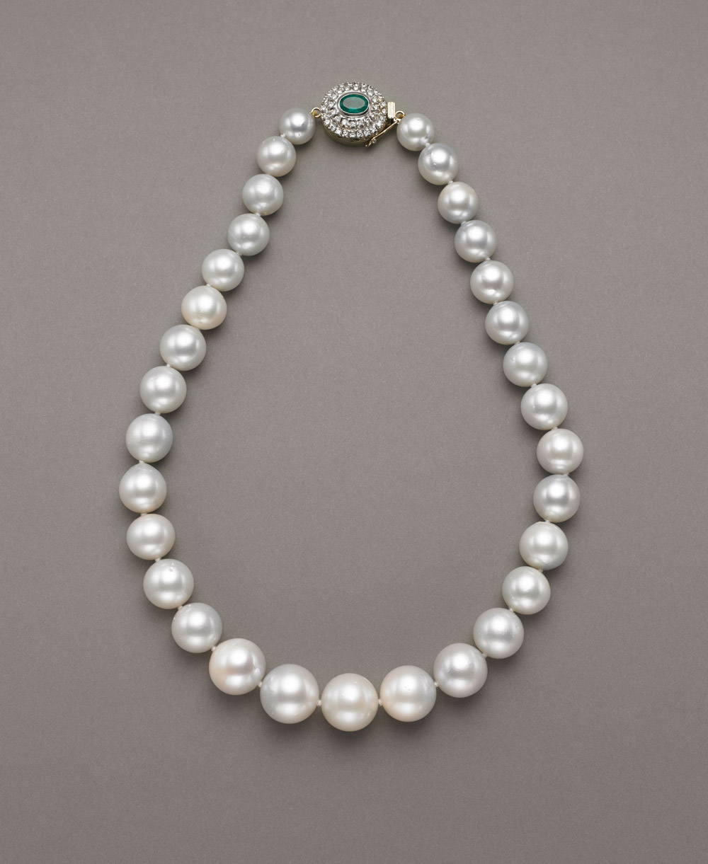Collana di perle coltivate South Sea scalata da 11,50mm. a 17,50mm. di colore bianco con sfumatura grigia e chiusura in oro bianco e giallo, smeraldo centrale ovale taglio composito di ct.1,50 circa e diamanti rotondi taglio a brillante per circa ct.0,60, lungh. 49cm, complessivi g.142,10 Accompagnato da verifica CISGEM n.30012 del 6/03/2002 Cultured South Sea pearl necklace with emerald and diamond white gold clasp Appended CISGEM certificate