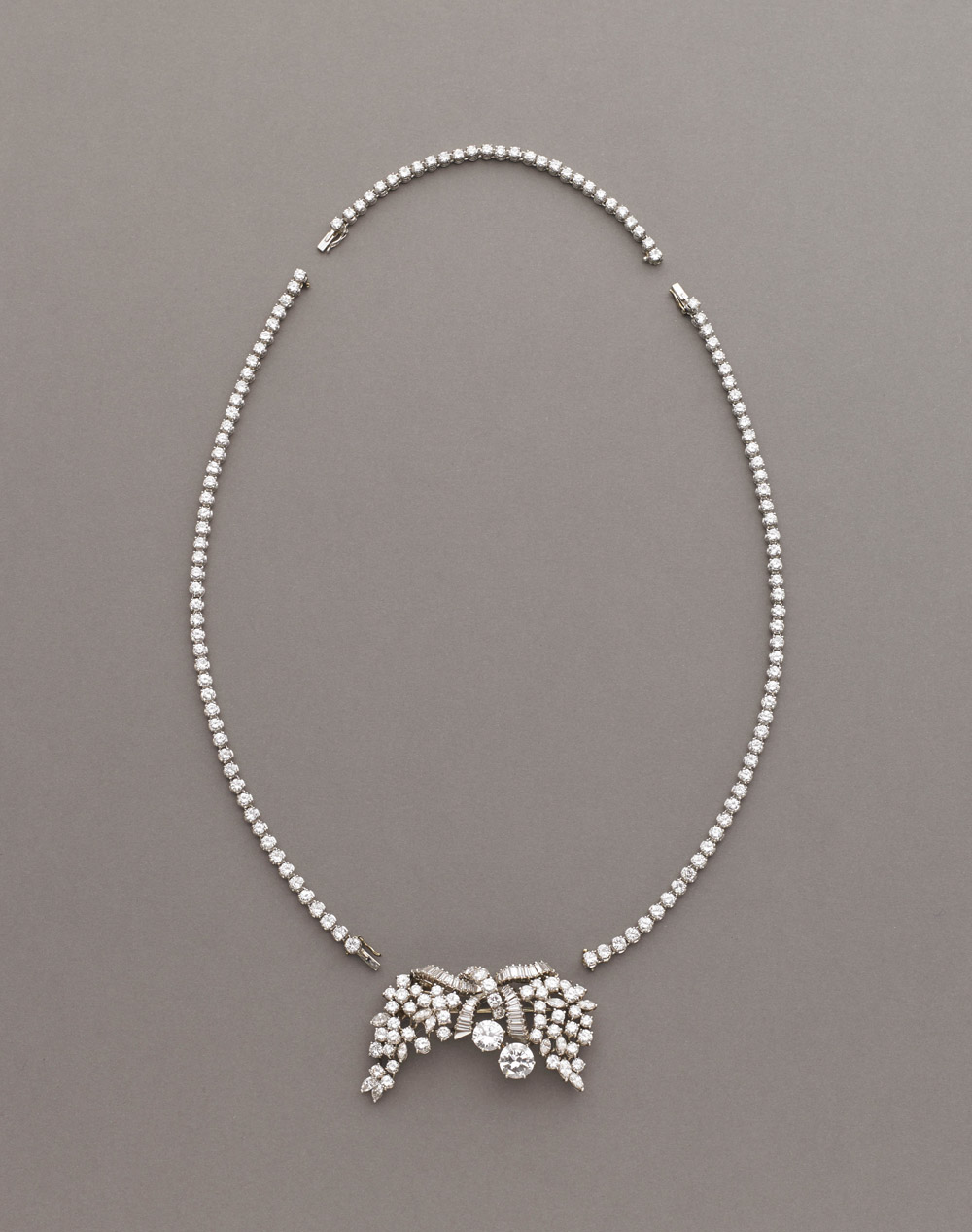 Spilla a nastro con due diamanti centrali rotondi taglio a brillante rispettivamente di ct.1,40 e ct.2,10 circa ed altri rotondi trapezioidali e a baguette. La spilla è dotata di un sistema a scomparsa per l'attacco ad un collier tennis scomponibile in due bracciali e pezzo supplementare per allungare il collier in diamanti rotondi taglio a brillante, tutto in oro bianco, complessivi g.54,90 Accompagnato da Jewelry REPORT GECI n.1009936 del 1/04/2015 Diamond white gold bow brooch that can be attached to rivière necklace divisible into two bracelets and extra piece to lenghthen necklace Appended GECI Jewelry Report
