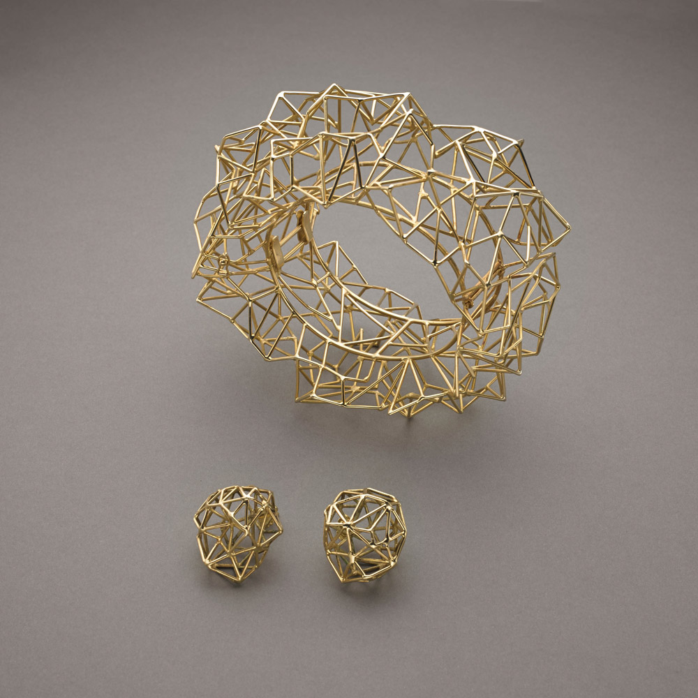 Parure: bracciale ed orecchini in oro giallo, trattasi dei primi campioni realizzati da Cleto Munari, design Giorgio Vigna per la collezione "Segmenti". Scatola originale, 1988. g. 118,50 Group of jewellery comprising a gold bracelet and earings realized by Cleto Munari, design Giorgio Vigna for the "Segmanti" collection. Original box, 1988