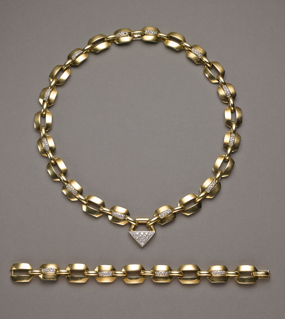 Demi-parure in oro giallo e bianco: bracciale e collier unibili con intercalari di diamanti rotondi taglio a brillante come nel pavé nel centrale pendente del collier, complessivi g.221 (mancante di un diamante). Punzone: 160 AL-Lunati Diamond-set bi-coloured gold demi-parure comprising anecklace and a bracelet (one diamond missing). Marked Lunati