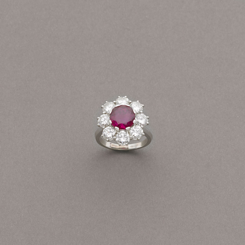 Anello a fiore in platino con otto diamanti taglio a brillante, per ct.2,70 circa ed al centro un rubino di ct. 2,00 circa, g.8,10, misura: 9,49 punzonato MI 30 Accompagnato da Jewelry REPORT GECI n. 1009942 del 31/03/2015 Ruby and diamond cluster ring Appended GECI Jewelry Certificate