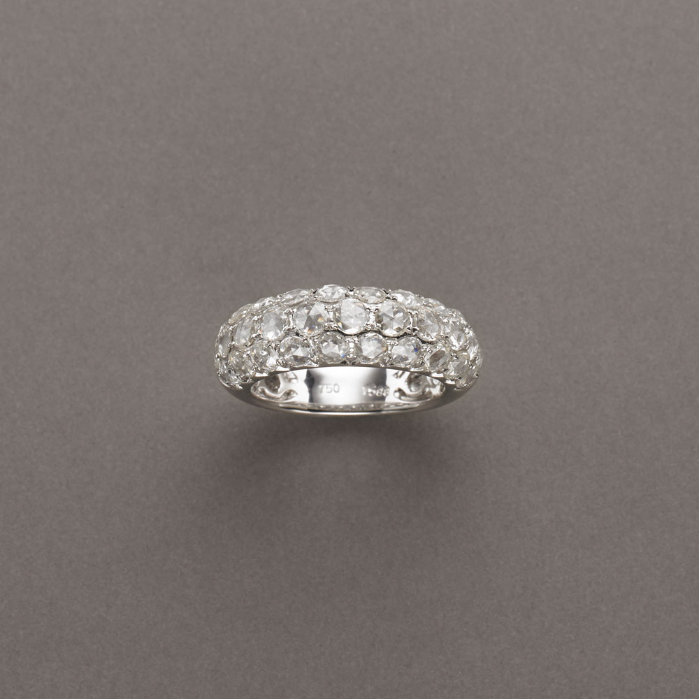 Fascia bombata in oro bianco con pavè di diamanti taglio "mezzo briolè" per ct.1,60 circa. gr. 5,70. misura 12/52. Diamond-set white gold band ring