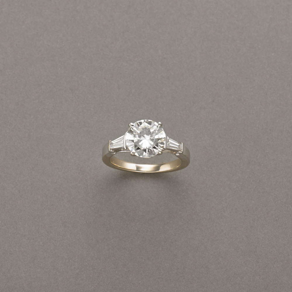 Anello in oro bianco e giallo rodiato bianco con diamante centrale rotondo taglio a brillante ct.2,05 e due diamanti trapezioidali taglio tapered sul gambo, g.3,80, misura: 10/50 Accompagnato da Jewelry Report GECI n.17872 del 17 Febbraio 2015 Diamond single stone ring with diamond shoulders Appended GECI Jewelry Report