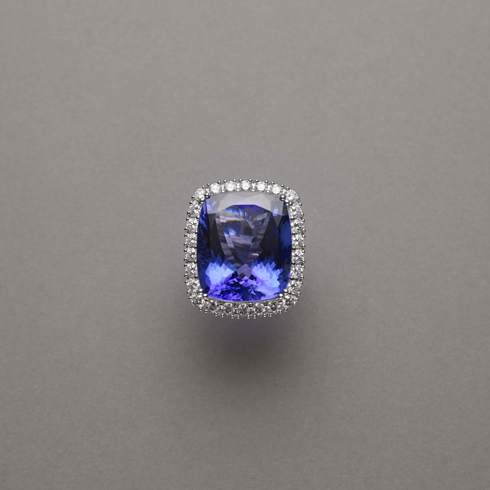 Classico anello in oro bianco con al centro una splendida tanzanite di forma a cuscino taglio composito di ct.30,10 contornata da diamanti per ct.2,60 circa. gr. 15,70 misura 12/52. Tanzanite and diamond white gold cluster ring